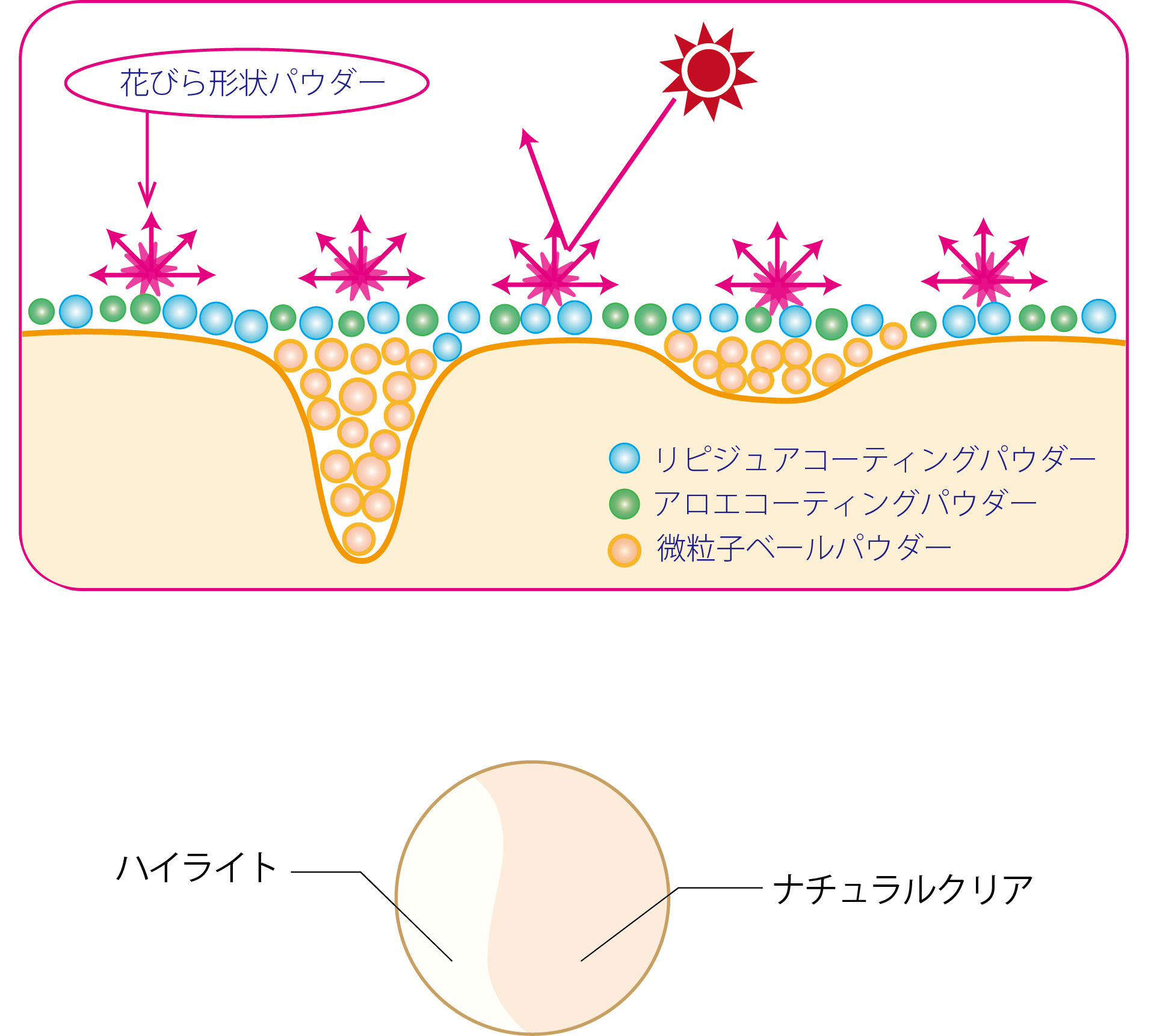 お肌に潤いを与え、小ジワ、毛穴を目立ちにくくし、ファンデーションのつき、のび、もちを良くします。